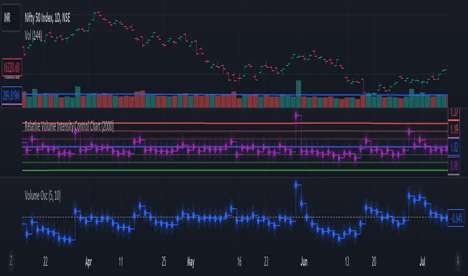 Introduced another factor, Time Normalized Intensity: Version 2 includes a new component called Time_Normalized_Volume_Intenstiy, calculated using a function that Trading view has release calculates relative volume ratios by comparing current volume at a particular time with average volume over previous n days at the same time, for example at 9:15 AM. This is a significant addition compared to Version 1. This accounts for volume spikes which are just time dependent like the spike in volume at the opening of a day. The default is ~0.33% weight is given to Point Volume Intensity, Mean volume Intensity and Time Normalized Volume Intensity. This captures a more compressive snapshot of volume compared to its historical value. Script de código aberto