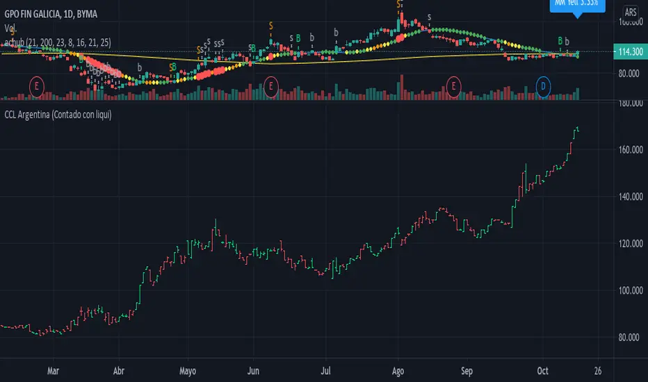 This indicator shows color bars graph about the CCL price , this is calculated with 5 Argentine tickers that have ADRs (tikers) in USA market. These are GGAL BMA YPFD PAMP BBAR .