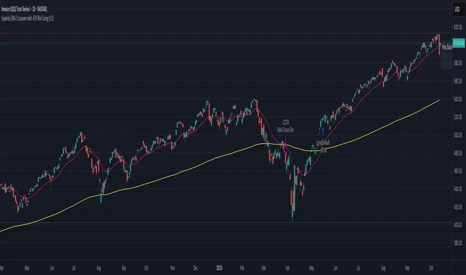 It combines a classic exponential moving average (EMA) crossover system with ATR-based risk sizing and optional trailing stops, closely modeled on the ideas and system examples Seykota published on his website.