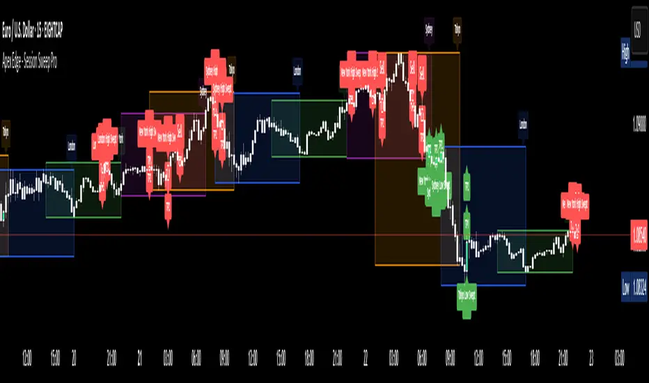 The Apex Session Sweep Pro is a precision trading tool designed for identifying high-probability liquidity sweep entries during key global market sessions. It combines powerful sweep detection logic with dynamic candle colouring, session visualization, TP projections, and real-time alerts — all within a clean, performance-optimized Pine Script engine.