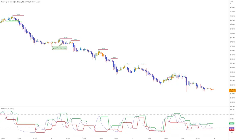 The logic of building the indicator: We build a channel based on the RSI extremes. The exit of the RSI from the channel up is the beginning of the uptrend, the exit of the RSI from the channel down is the beginning of the downtrend. In the downtrend, the candles are colored blue, in the uptrend - orange.
