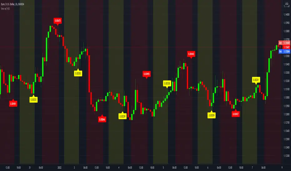 This indicator also tracks the session high/low difference and plots it as a label on the last candle of the session once the last
