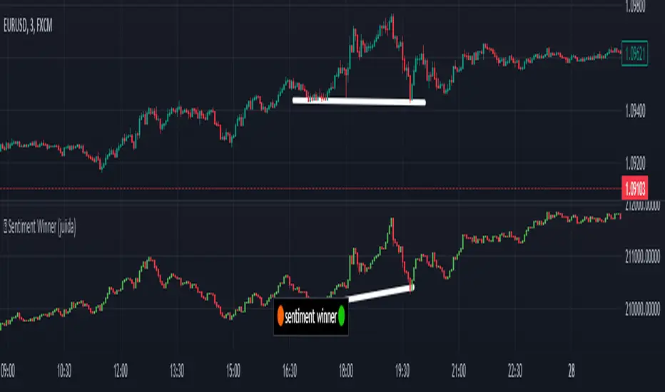 Though this indicator looks like having candlesticks, well they are not, they are just some visualization. The logic behind sentiment winner involved complex mathematics. But the primary aim is to check where pump and dump happens on high volume index and forex pair. Things gets interesting when you count forex effect and the respective country's option market effect alongside.