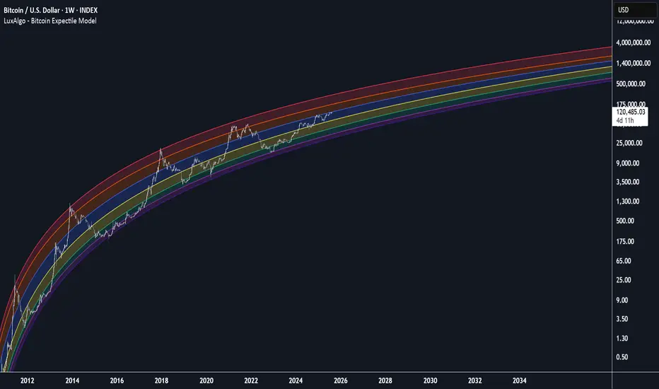 While the model is made for Bitcoin using a log scale, other assets showing a tendency to have a trend evolving in a single direction can be used. See the chart above on QQQ weekly using a linear scale as an example.