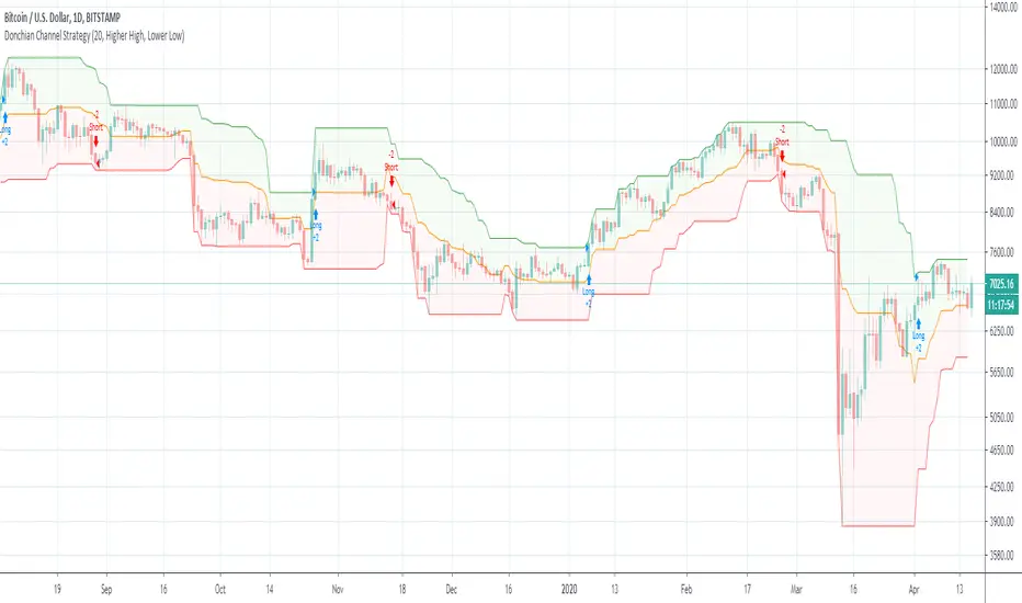 Long and Short entries based on the Donchian Channel indicator. The entry can be set to Higher High/Lower Low or the basis line.