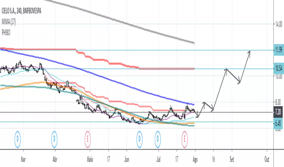 Indicador de Bo Williams usando no PhiCube. Três canais de Donchian, pintados no gráfico somente quando podem indicar tendência. Apresentam níveis importantes de resistência e suporte em tendência.