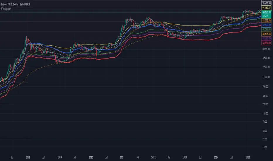 This indicator combines critical Bitcoin on-chain metrics with traditional technical analysis to identify key support levels and price trends. It's designed to help traders and investors understand Bitcoin's fundamental value zones and market positioning.