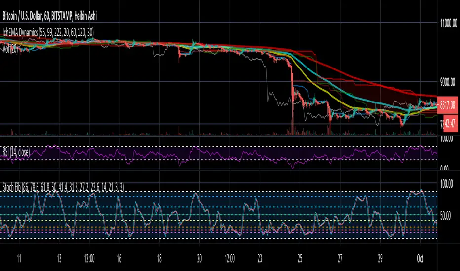 This is your run-of-the-mill stochastic indicator, with one slight difference. I added Fibonacci ratios [0, 0.272, 0.318, 0.414, 0.5, 0.618, 0.786, 100] and colored them across the rainbow for aesthetics.
