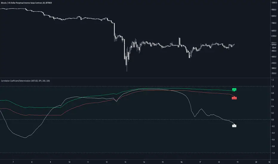 Measures the correlation between 2 assets, along with the coefficient of determination of the average of 200 candles. By default, 2 correlations are presented but only 1 with a coefficient of determination (default 200).