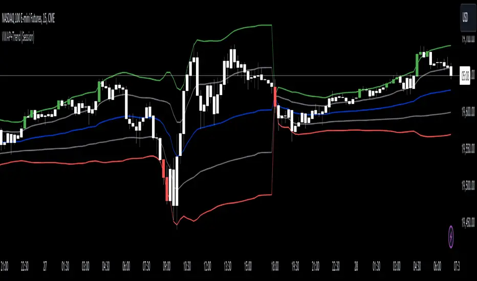 This indicator is highly customizable and builds off of the core logic found in standard VWAP indicators. By allowing traders to adjust the standard deviation multipliers and choose their preferred bar coloring strategy. It caters to various trading styles, whether focusing on the broader market trend or pinpointing significant trend-based movements.