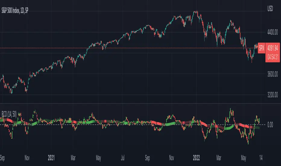 Smoothed RCO Line (long length) : a moving average of the average of the low, close, open and high calculated for the RCO Candles. The line's transparency is determined by the percentage difference between the RCO and the highest or lowest RCO over the long length. A more transparent line means that the RCO is closer to the highest or lowest RCO, and may be indicative of a reversal, or weakening trend.