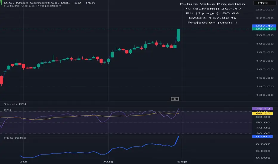 This indicator calculates the future value (FV) of the current ticker’s price using its historical Compound Annual Growth Rate (CAGR). It measures how much the price has grown over a chosen lookback period, derives the average annual growth rate, and then projects the current price forward into the future.
