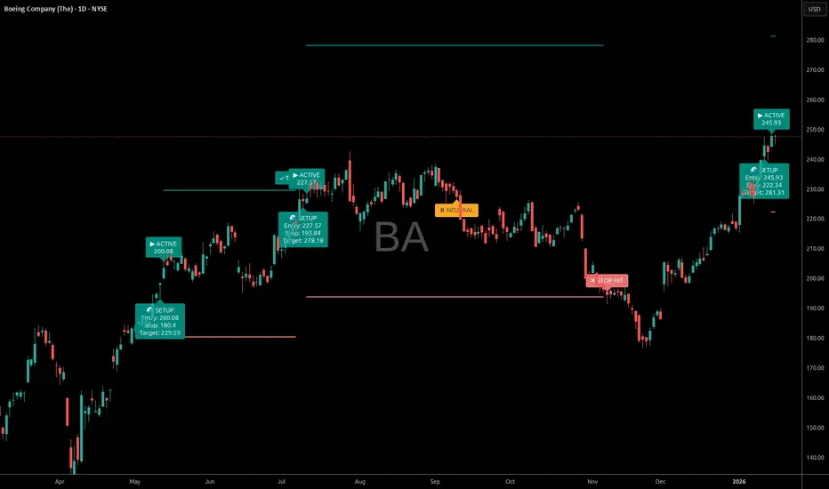 🎯 Smart Labels: Setup signals below the candle, active trades above, clean separation without overlaps.