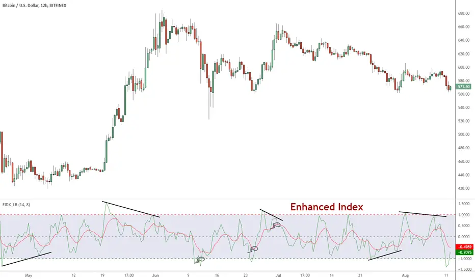 The Enhanced Index (EIDX) is a modified William %R that behaves much like the original, to indicate overbought and oversold market conditions.