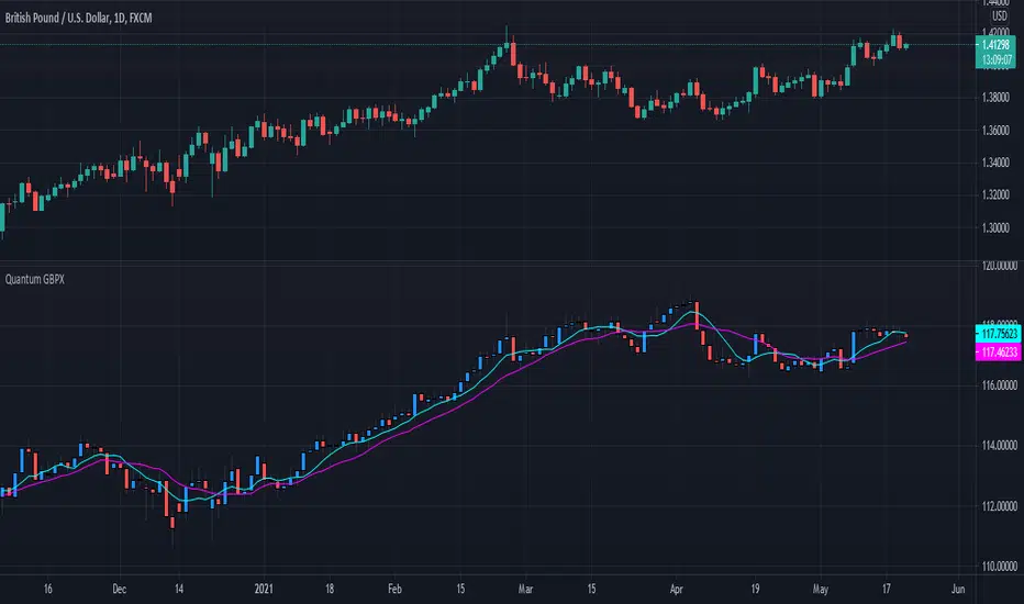 The indicator plots strength and weakness of the UK pound as a candlestick chart in a separate indicator window when you attach it to the chart. In addition, there are two configurable simple moving averages to make chart reading easier.