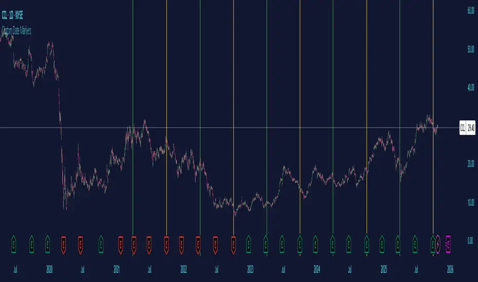 This indicator provides a powerful visual tool for technical and pattern analysis by allowing traders to mark up to 10 specific historical dates with customizable vertical lines on any chart. Each date can be assigned its own unique color, making it easy to categorize and distinguish between different types of events or market catalysts.