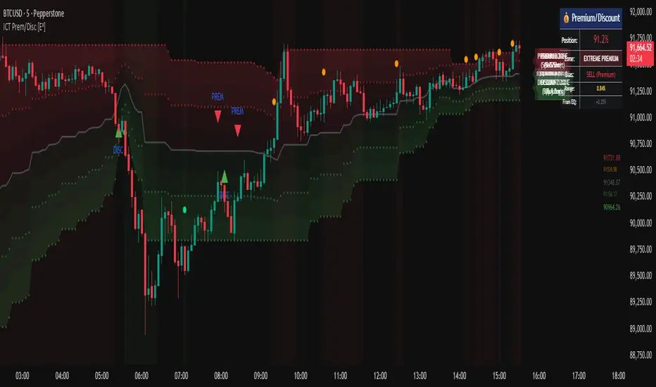 Premium/Discount Zones automatically identifies where price is "expensive" (premium) versus "cheap" (discount) relative to recent price action. Based on ICT (Inner Circle Trader) concepts, this indicator helps you follow the golden rule of trading: "Buy Discount, Sell Premium" - just like institutions do. Know at a glance whether you should be looking for longs, shorts, or staying flat.