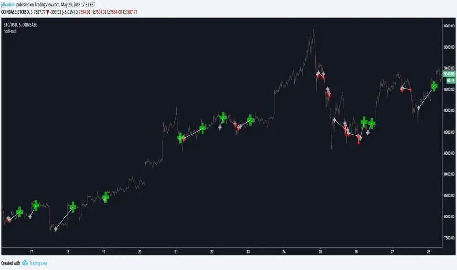 Hodl-Sodl itself is not a strategy. It is a framework for building AutoView strategies. For demonstration purposes, the image featured with this script shows an example of a very simple CCI strategy (and not a very good one), but you would presumably replace that with your own ideas. If you'd like a little help plugging in your own strategy, contact jdhadwin for custom coding.