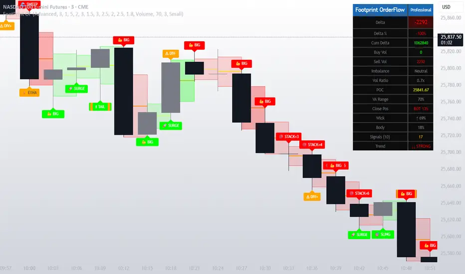 The Bar Market and Order Flow Footprint indicator is an original TradingView tool designed to help traders analyze balanced market conditions and the order flow behavior that occurs within them. The indicator combines bar-based balance detection with footprint-style order flow estimates to provide insight into rotation, participation, and directional pressure directly on the price chart.