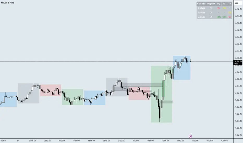The SMT FILL indicator is a multi-market tool that tracks Fair Value Gaps (FVGs) in NQ, ES, and YM and monitors when those inefficiencies get filled — all organized using a time-cycle structure (sessions, days, weeks, etc.).