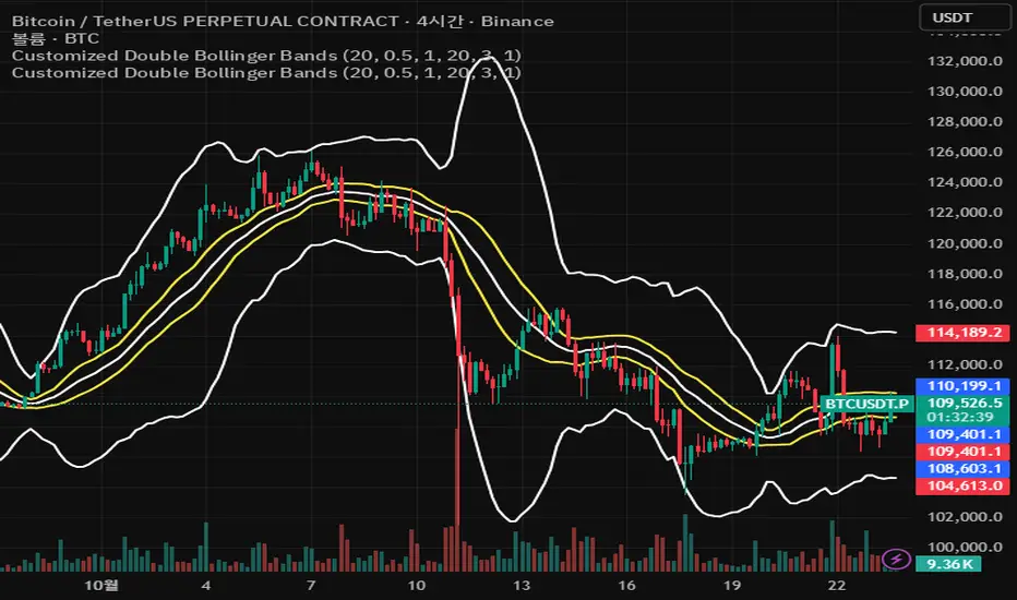 🌐 English Version This indicator combines two Bollinger Bands to visualize both short-term and extreme volatility zones on the same chart. While a standard Bollinger Band shows how far price deviates from its mean, this customized version displays two standard deviation ranges, allowing traders to distinguish between mild and extreme volatility conditions. Band 1 (StdDev 0.5) captures short-term fluctuations near the price average, while Band 2 (StdDev 3.0) highlights overbought or oversold conditions at market extremes. When the distance between the two bands widens, volatility is increasing; when it narrows, the market is stabilizing or preparing for a breakout. ㆍPrice breaking above Band 2 → Potential overbought or strong bullish trend ㆍPrice falling below Band 2 → Possible oversold or bearish continuation ㆍBands tightening → Volatility compression, potential reversal zone This indicator is designed primarily for volatility visualization rather than directional prediction. For higher accuracy, use it alongside RSI, MACD, or trend-based indicators. Developed by wjdtks255