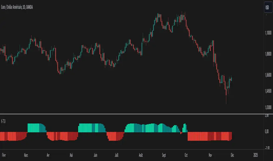 The K-TSI's visual representation as a color-coded histogram further enhances its utility. The changing colors and intensities provide an intuitive way to gauge both the direction and strength of trends, making it easier for traders to quickly assess market conditions.