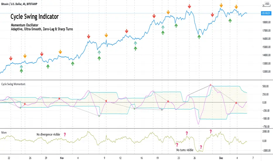 The indicator works without any parameter and can be applied to any chart and any time-frame. It will adapt automatically to the Dominant Cycle and use the dominant cycle of the source data to derive the ultra smooth momentum curve. Adaptive upper/lower bands are included and highlight areas with extreme readings. Automatic divergence detection can be turned off/on.