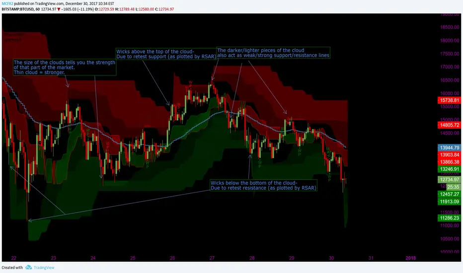 In a strong bear market, you are likely to see the price move in between the green cloud and the RSAR resistance line. Inversely,in a strong bull market most of the price action should occur between the red cloud and the RSAR support line.