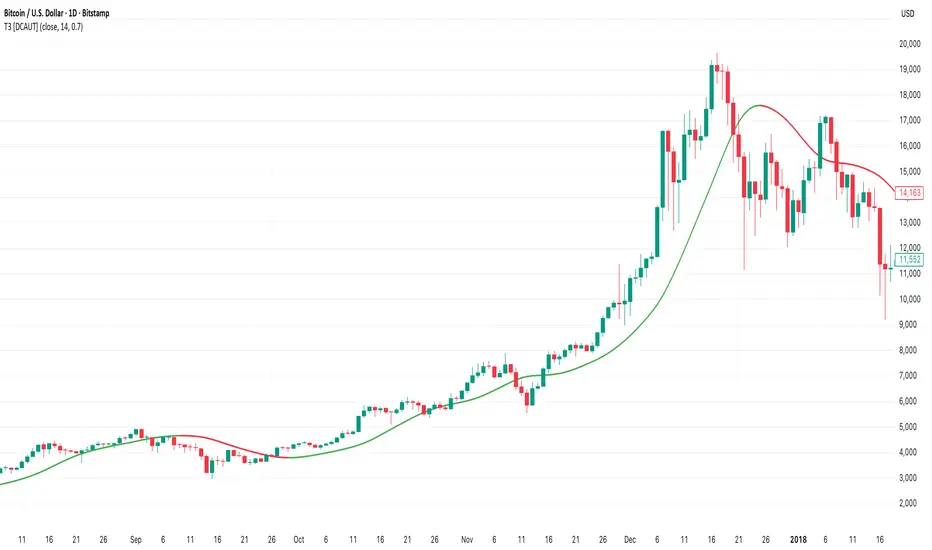 The T3 Moving Average is a smoothing indicator developed by Tim Tillson and published in Technical Analysis of Stocks & Commodities magazine (January 1998). The algorithm applies Generalized DEMA (Double Exponential Moving Average) recursively three times, creating a six-pole filtering effect that aims to balance noise reduction with responsiveness while minimizing lag relative to price changes.