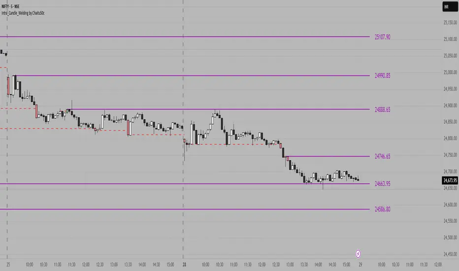 The indicator identifies potential intraday support and resistance levels based on the "Intra Candle Welding" concept: when the close of one candle is very close to the open of the next candle, and the two candles have opposite directions (bullish followed by bearish, or bearish followed by bullish). These levels often attract market attention due to order flow imbalance created during such transitions.