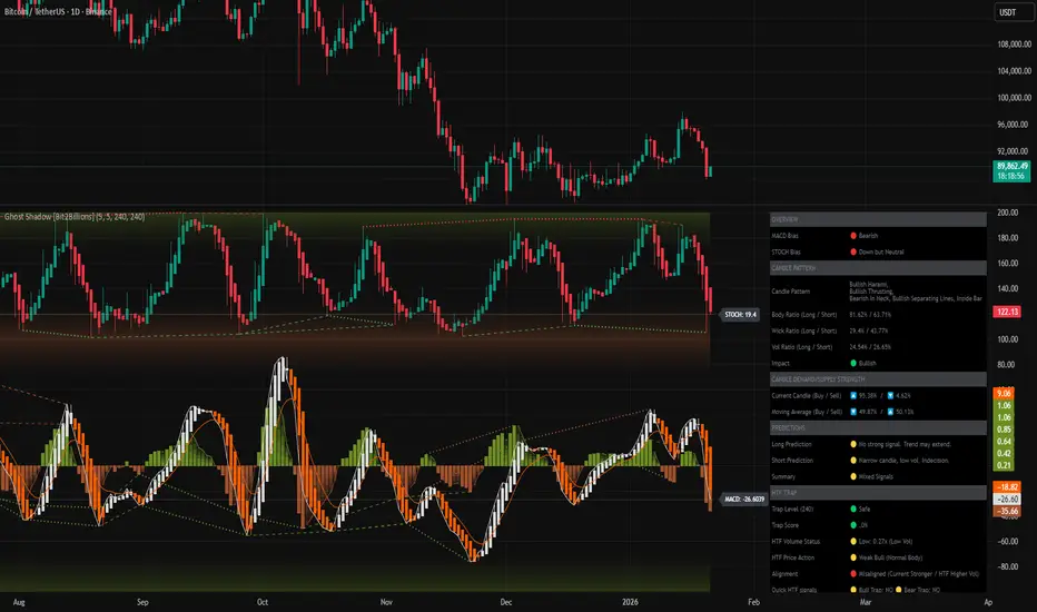Ghost Shadow combines MACD-based momentum, stochastic pressure, divergence logic, candle behavior, and supply/demand scoring because momentum cannot be reliably interpreted using a single oscillator.