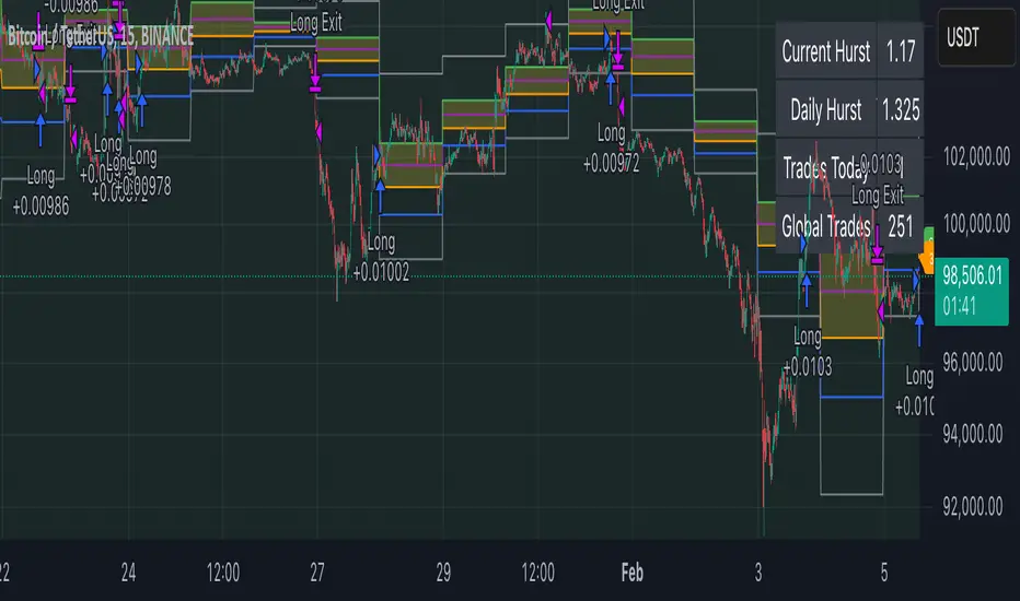 The Hurst exponent is calculated on both the chart’s current timeframe and a higher timeframe (default: Daily) to capture both local and broader market dynamics.