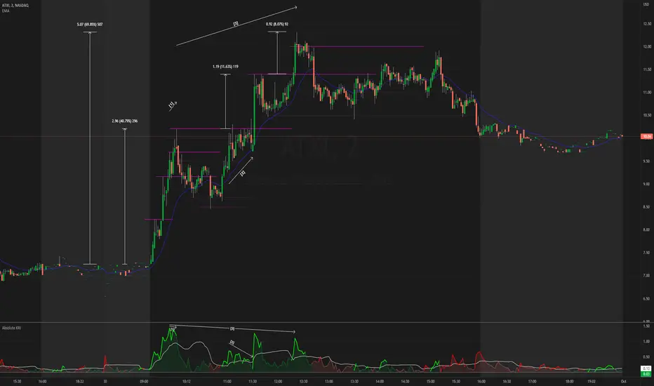 The chart snapshot image above shows ATXI moving ~70% from its open on 30/09/22. From open to midday, we can see price extend away from the 21 EMA (impulses) several times, with retracements back towards the EMA following right after. Let's look at 3 main examples of price creating new highs.