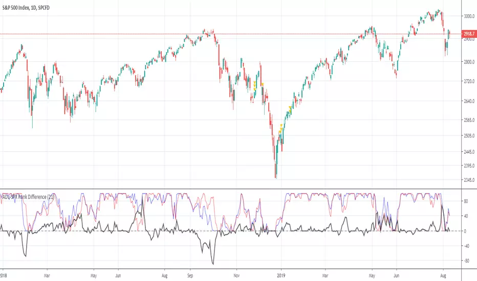 An expansion of the Advance Decline Line of the NYSE. It can be interesting to compare the Advance Decline Line with the corresponding benchmark index. I therefore made a ranking (0 to 100) based on the performance over the last days (default: 21 days). The difference is the target figure and ranges between -100 (bearish divergence) to +100 (bullish divergence).