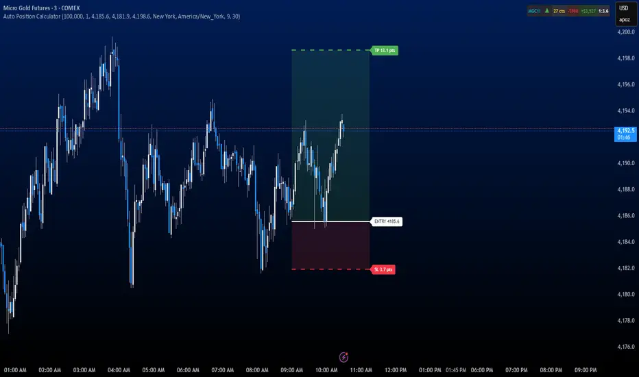 This indicator calculates how many contracts, lots, or shares to trade based on your account size, risk percentage, and stop loss distance. It auto-detects the instrument type and adjusts the point/pip value accordingly.