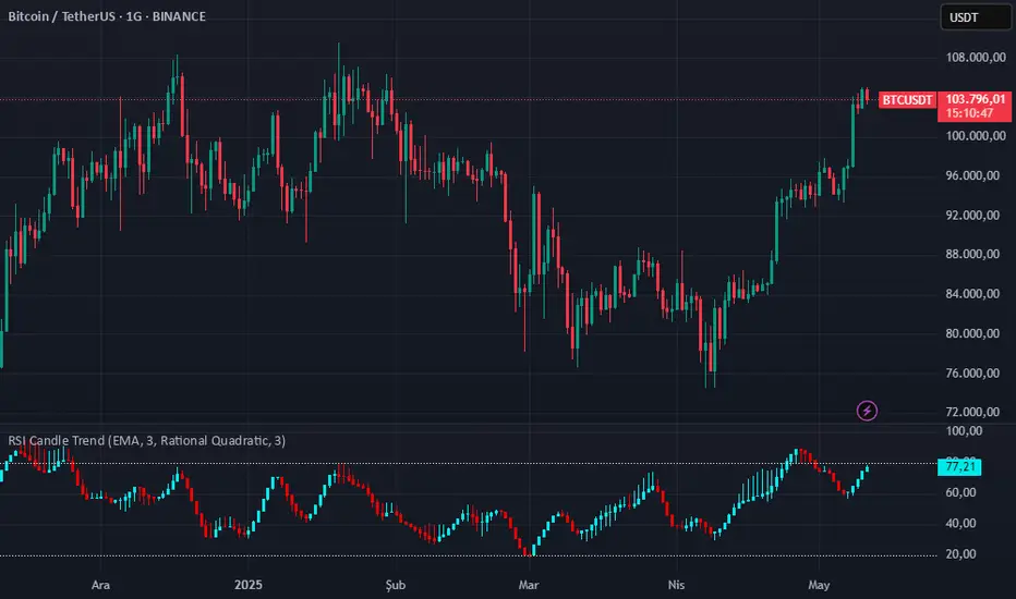 This TradingView script is designed to visualize trend strength using RSI values as candle data, instead of traditional price candles. It transforms RSI data into custom candles using various smoothing and filtering methods (like Heikin-Ashi, Linear Regression, Rational Quadratic Filter, or McGinley Dynamic). It allows traders to: