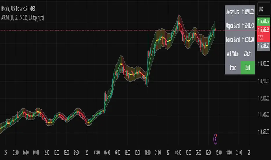 The ATR Money Line Bands V4 is a user-friendly technical indicator for TradingView charts that helps traders spot trends and volatility in asset prices, like stocks or cryptocurrencies. At its core, it draws a central "Money Line" (a smoothed trend line based on linear regression of closing prices) surrounded by upper and lower bands calculated using the Average True Range (ATR), which measures market volatility. The bands expand or contract dynamically with price swings, and the line/bands change colors (green for bull, red for bear, yellow for neutral) based on the trend's direction and strength. It's great for visualizing support/resistance levels and potential breakouts without overwhelming the chart.Tips for Usage