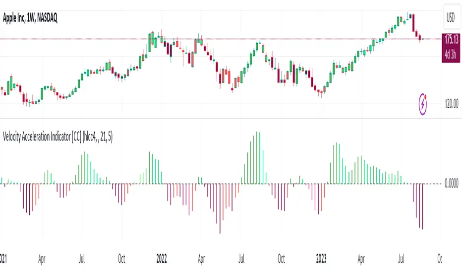 The Velocity Acceleration Indicator was created by Scott Cong (Stocks and Commodities Sep 2023, pgs 8-15). This is another personal variation of his formula designed to capture the overall velocity acceleration of the underlying stock by applying the velocity formula to the original indicator to find the acceleration of the underlying velocity. I changed a few things around and managed actually to get less lag and quicker signals for this version, so make sure you compare the Velocity Indicator script that I published yesterday. This indicator is also visually similar to a typical stochastic indicator but uses a different underlying calculation. This works well as a momentum indicator, and the values are completely unbounded, so the best ways to determine bullish or bearish trends is either by using a crossover or crossunder between the indicator and the midline or to buy or sell the indicator when it reaches a high or low point and starts to fall or rise respectively. I used the zero line for my default version to help determine the bullish or bearish trends. I have also included multiple colors to differentiate between very strong signals and normal signals, so very strong signals are darker in color, and normal signals use lighter colors. Buy when the line turns green and sell when it turns red.