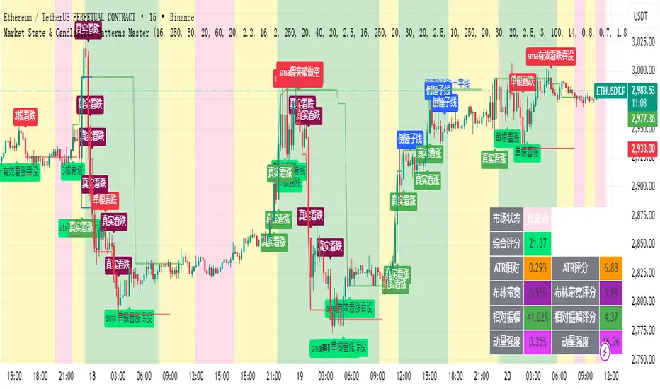 The Market State & Candlestick Patterns Master (MSCP-Master) is a comprehensive, all-in-one technical analysis indicator that combines real-time market state identification with multiple candlestick pattern recognition. This powerful tool not only identifies classic price action patterns but also adapts their significance based on the current market volatility environment, providing context-aware trading signals for smarter decision-making.