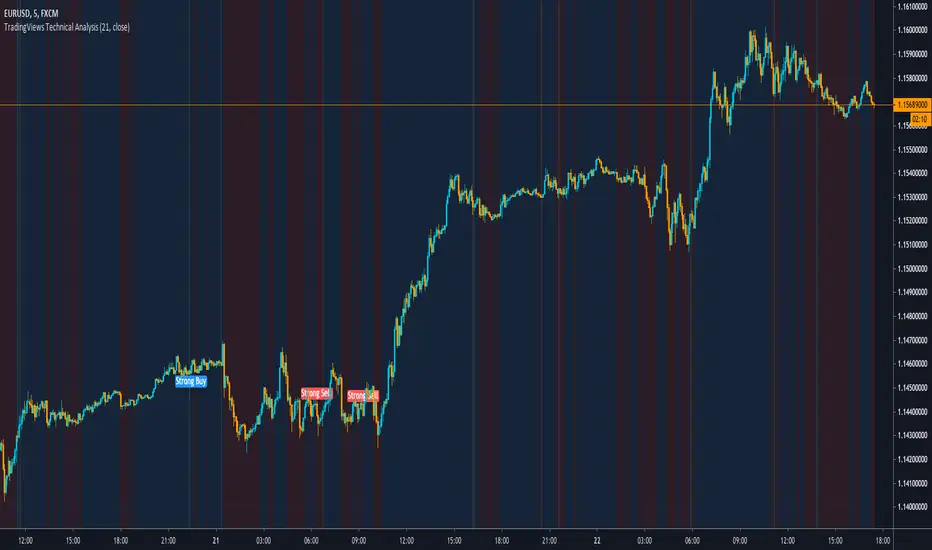 All indicators used on the Technical Analysis Summary from TradingView, composed with oscillators and moving averages. Sell and strong sell will represent more indicators showing sell signals. Buy and strong buy will represent more indicators showing buy signals. A white bar will show neutral signal (don't trade). This can be good for binary options or scalping on small time frames, but also very good on higher times for forex. The signal will appear on the candle before, so wait for the new candle to appear to see what direction the signal will indicate.