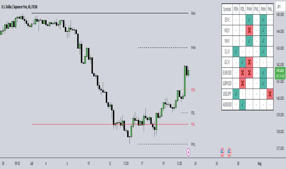 By default, the dashboard will use a compact view where the green ✔ means that price has swept and is currently exceeding the level of interest, the red ❌ implies that price swept the level but reversed back into the original range, and - indicates that the level hasn't been reached. However, the dashboard text can be toggled to show the numerical values of the highs and lows instead of these compact strings, as shown in the following image.