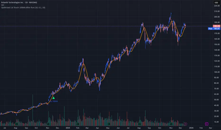 This indicator is designed to identify strong stocks that have recently made a meaningful rally and are now experiencing their first controlled pullback to the 10-day simple moving average (10SMA). It scans for stocks that have moved at least 10% over the past 10 trading days, maintained upward momentum by riding above the 10SMA during the advance, and are trading within a broader uptrend. The signal triggers only when price makes its first touch of the 10SMA since the rally and closes back above it, indicating potential support and trend continuation rather than weakness. Additional filters such as volume contraction and higher-timeframe trend alignment help isolate high-quality setups where strong stocks are digesting gains before a potential next leg higher.