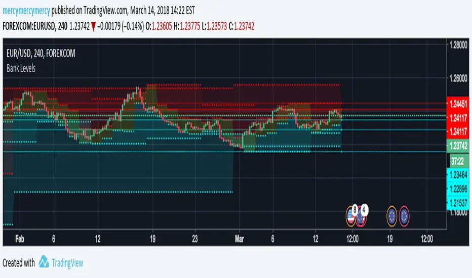 Bank levels - highs and lows - of the previous day, week, and month only, colored in for visual effect. Includes history of past bank levels as opposed to my other bank levels script.