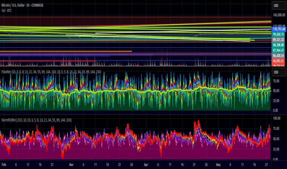 Plots both standard and Z-score normalized RSI ribbons using Fibonacci-based periods. Supports adjustable normalization, optional 0–100 scaling, and multi-line visualizations for momentum and deviation analysis.