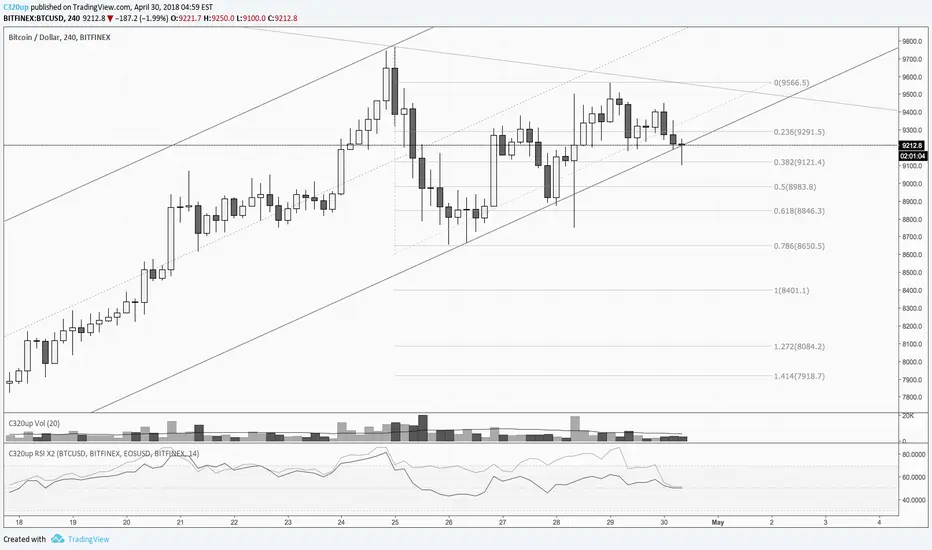 Default settings are a black line for the first ticker (Bitcoin), and gray for the second (EOS), with the RSI length set at 14.