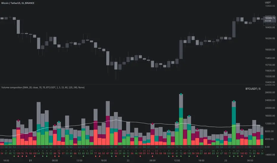 Timeframe settings can be changed via input menu. The lower the timeframe, the more precision you get but with the cost of less historical data and slower loading time. Users can also choose which source to use for determining buy/sell volume, e.g. using close as source, a close that is higher than previous close would be considered as buy volume. This could be replaced with OHLC4 for example, resulting in a volume direction based on OHLC average.