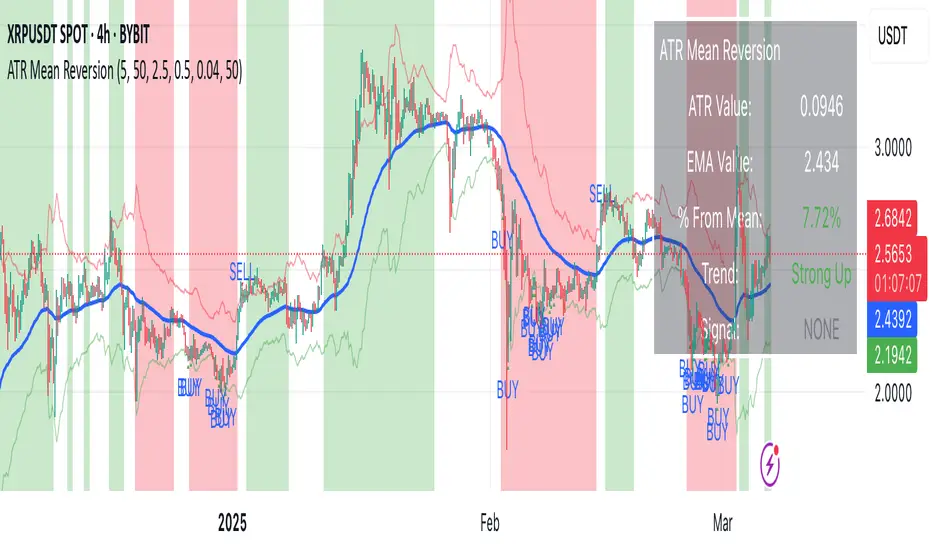 The ATR Mean Reversion Indicator is designed to identify potential reversal points in the market by detecting when price has become overextended from its mean. The indicator uses Average True Range (ATR) and Keltner Channels to determine when price has moved too far from its average, suggesting a possible reversion back to the mean.