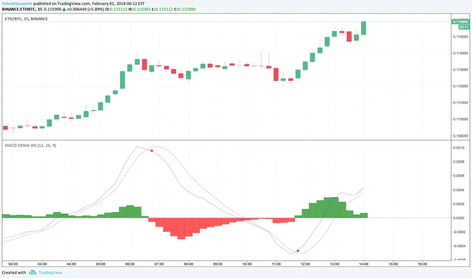 MACD sinyal üretirken 10-15 dakikalık bir delay'e sahip. Hayırsever bir vatandaş MACD ile DEMA'yı birleştirerecek bu gecikmeyi nötr hale getirmiş. Ben de sinyalleri gösteren küçük noktalar ekledim