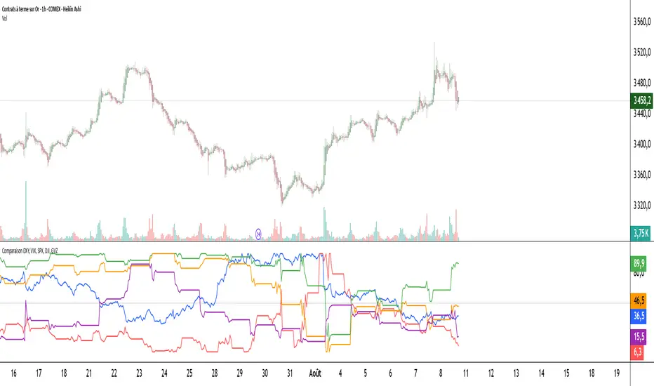 Comparaison DXY, VIX, SPX, DJI, GVZ