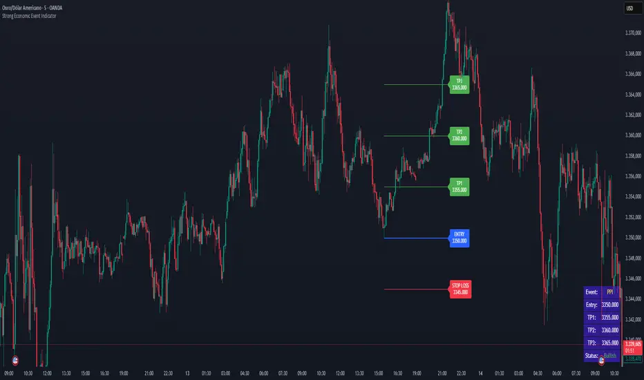 This indicator is designed for traders to visualize entry levels, targets (TP1, TP2, TP3), and stop loss around key economic events for the selected asset, defaulting to XAUUSD. It provides a clear reference for potential market movements based on the event's surprise and direction (Bullish, Bearish, or Neutral).